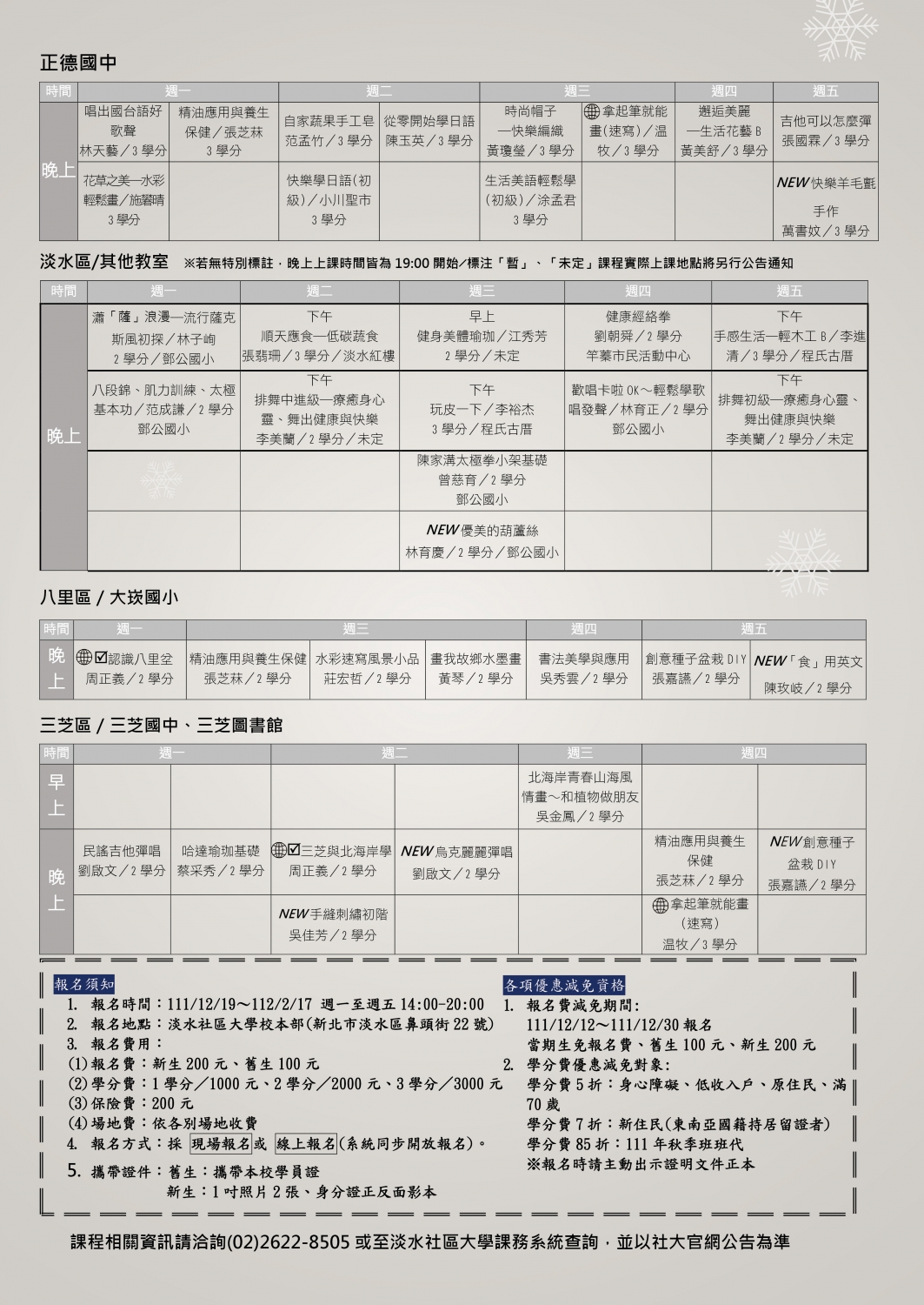 睦鄰專案:正德國中、鄧公國小、三芝國中、八里大崁國小合作開課學校之教職員,憑服務證報名112年春季班課程,學分費5折優待。