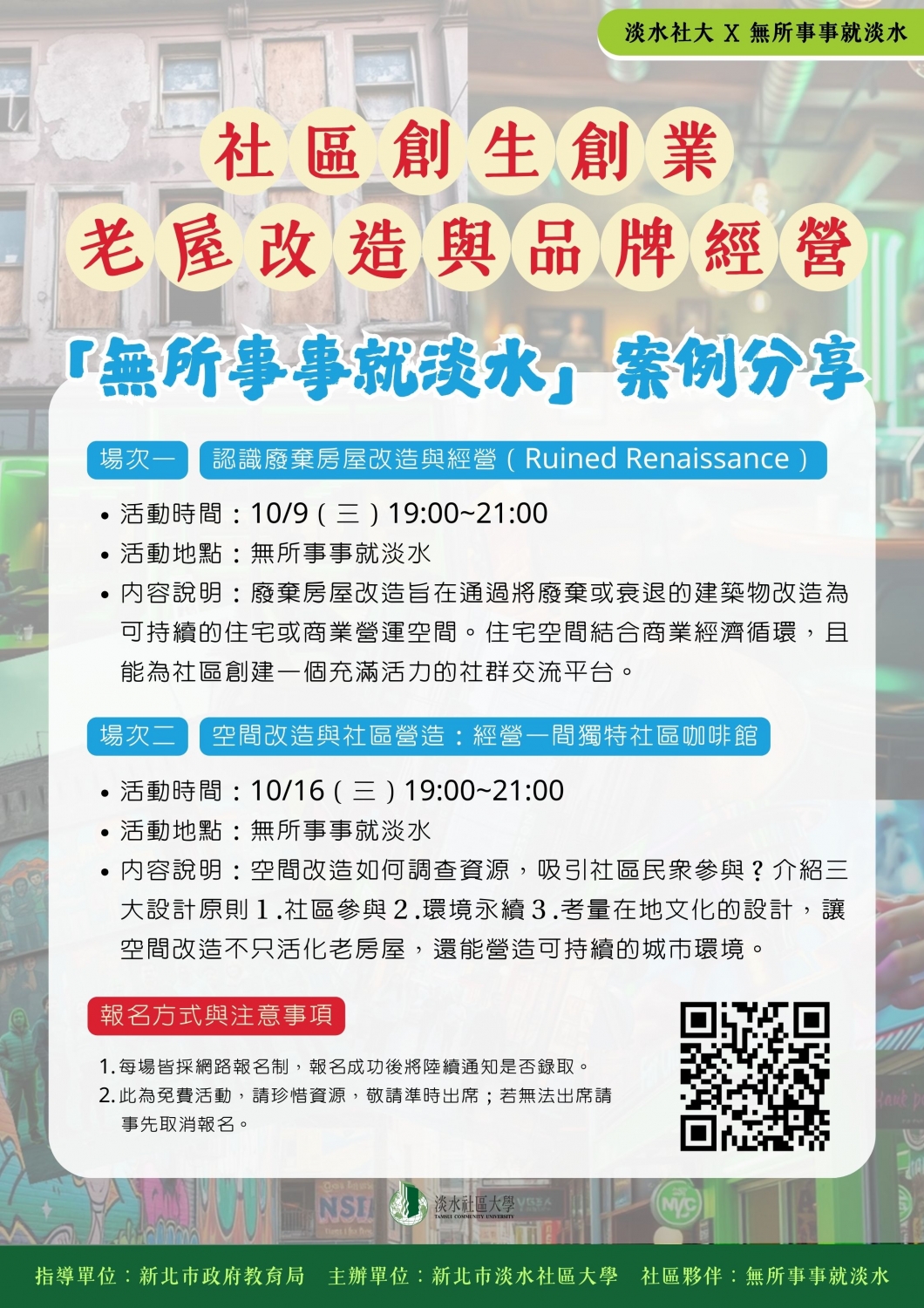 本次工作坊以特色空間──無所事事就淡水,作為成功案例。這個空間為廢棄老屋所改造,而如今是一間集藝廊與咖啡廳於一體的社區亮點。透過本工作坊分享關鍵概念,帶領有志經營特色空間的社參與者,深入了解從古蹟的活化利用到廢棄老屋的再生,延展建築物再利用與保存歷史文化價值,賦予老屋新生、實現資源重複循環再生。