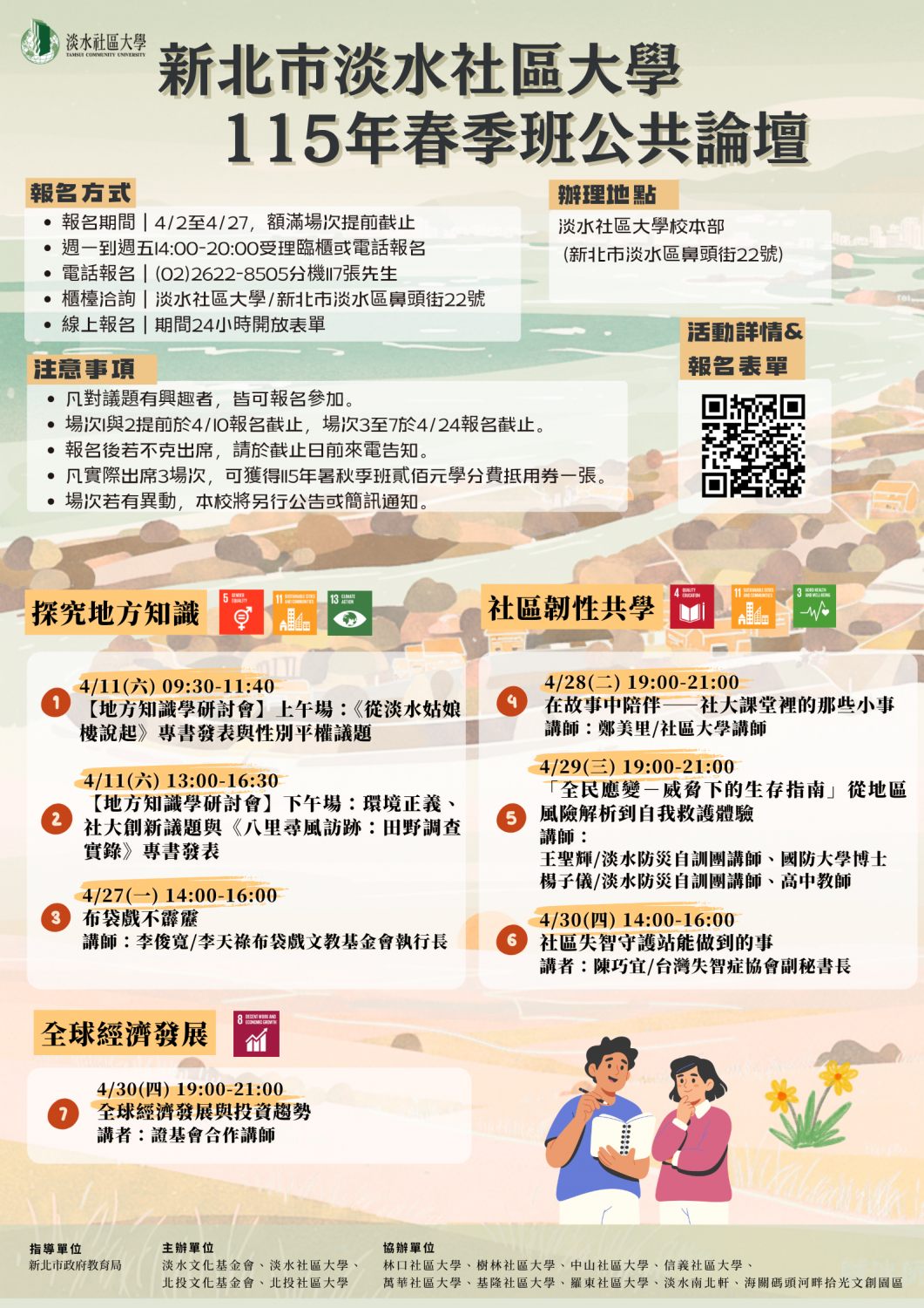 淡水社大115年春季班公共論壇4/11起登場,7場次從最在地的社區韌性到最國際的經濟發展趨勢,讓您成為可靠而有內涵的在地人!