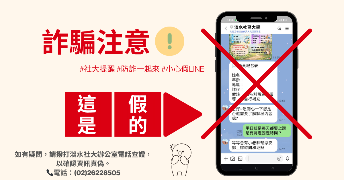 近期有不明人士偽裝成「淡水社大官方LINE」進行詐騙與騷擾,請大家務必提高警覺。